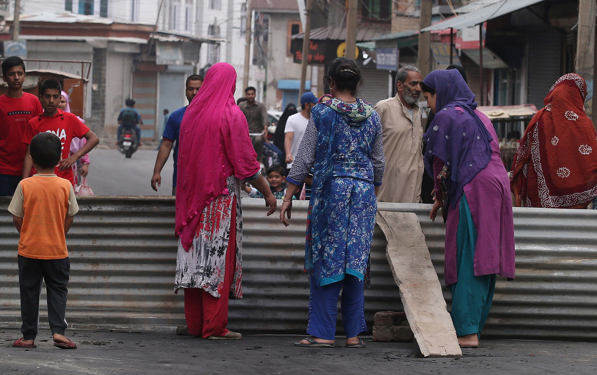 مقامی خواتین سری نگر کے ایک محلے میں ان رکاوٹوں کے پاس کھڑی ہیں جنہیں علاقے کے لوگوں نے انڈین سکیورٹی فورسز کا داخلہ روکنے کے لیے کھڑا کیا ہے۔