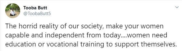 طوبیٰ نامی صارف نے لکھا ہے کہ یہ ہمارے معاشرے کی بھیانک حقیقت ہے۔ ’آج سے ہی خواتین کو چاہیے کہ وہ اپنے آپ کو خود مختار بنائیں، ان کو تعلیم اور صلاحیتوں کی ضرورت ہے تاکہ وہ اپنے پیروں پر کھڑی ہو سکیں۔‘