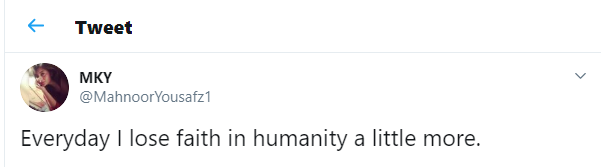 ماہ نور نامی صارف کا کہنا تھا کہ ان کا ہر روز انسانیت سے دل اٹھ جاتا ہے۔