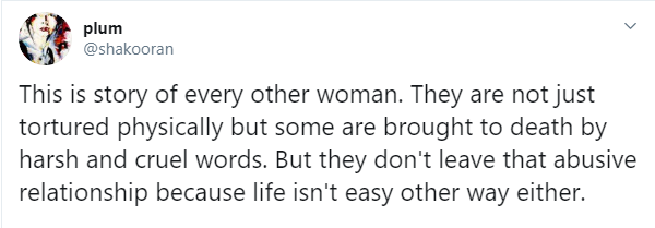 ایک اور صارف کا کہنا تھا کہ ’یہ ہر دوسری عورت کی کہانی ہے جو تشدد برداشت کرتی ہے مگر شوہر کو نہیں چھوڑ سکتی کیونکہ زندگی پھر بھی اس کے لئے آسان نہیں ہو گی۔‘