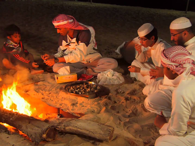 رات کو مزیدار کچہری ہوتی ہے۔ سالم بکرہ سیخوں پر پکایا جاتا ہے۔ کوئلوں پر عربی قہوہ اور کالی چائے پکتی ہے اور گپیں ہانکیں جاتی ہیں۔