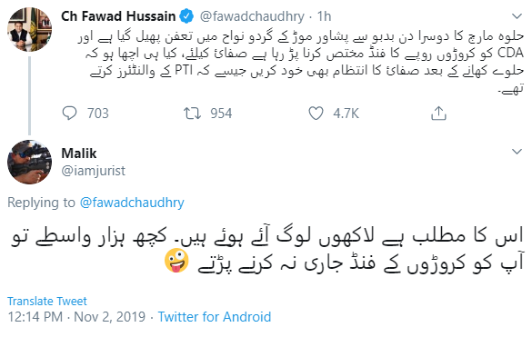 ٹوئٹر صارف آئی ایم جیورسٹ کے نام سے ایک صارف نے فواد چوہدری کی ٹویٹ کا جواب دیتے ہوئے کہا کہ کروڑوں کا فنڈ مختص کرنے سے معلوم ہو رہا ہے کہ لاکھوں لوگ آئے ہیں۔