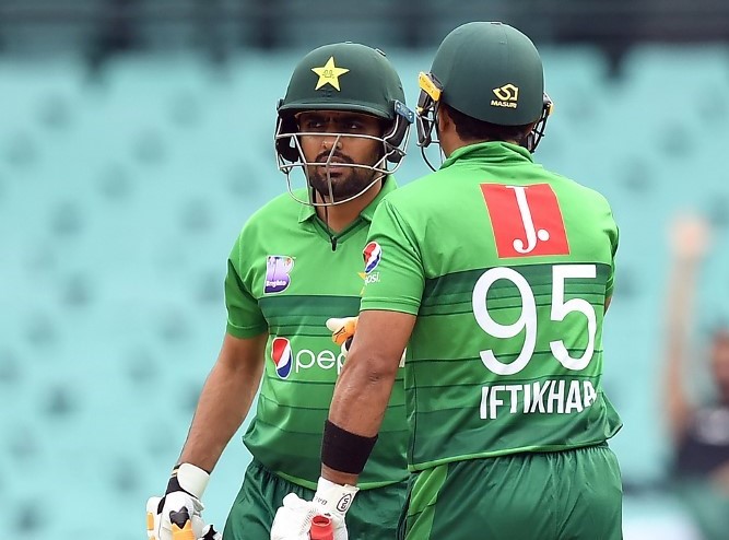 پاکستان کی جانب سے افتخار احمد اور بابر اعظم نے نصف سینچریاں سکور کیں، فوٹو: اے ایف پی