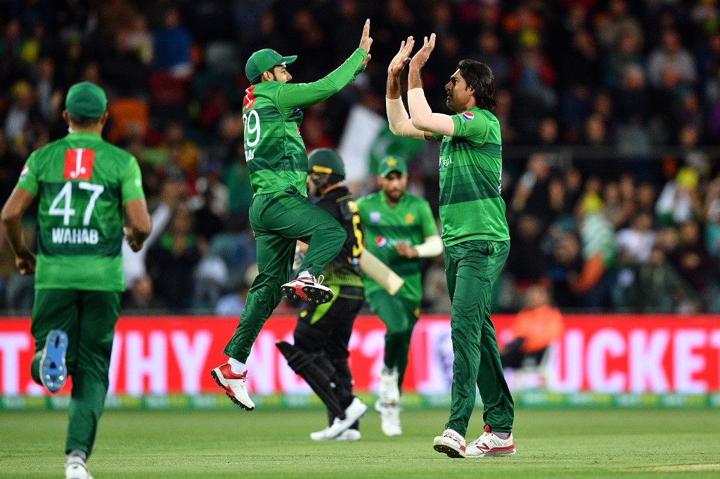 پاکستان کی جانب سے عرفان، عامر اور عماد نے ایک ایک وکٹ حاصل کی، فوٹو: اے ایف پی
