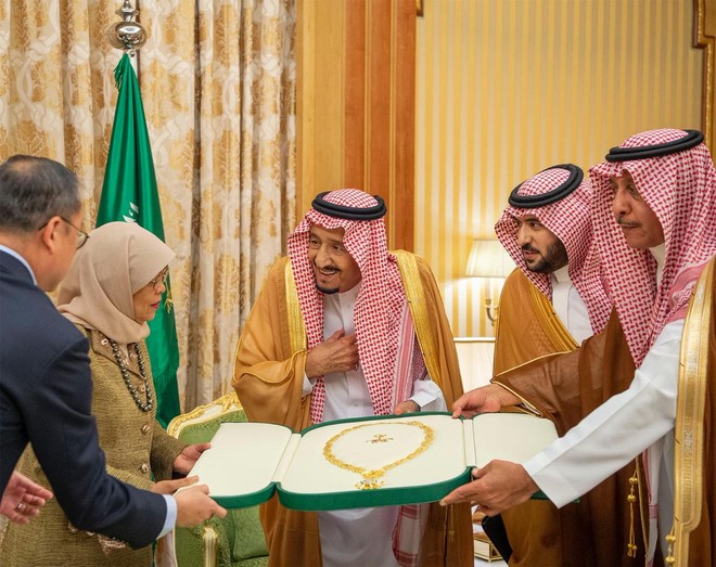 سعودی خبر رساں ادارے ایس پی اے کے مطابق شاہ سلمان نے مذاکرات سے قبل صدر حلیمہ یعقوب کو شاہ عبدالعزیز میڈل پیش کیا۔