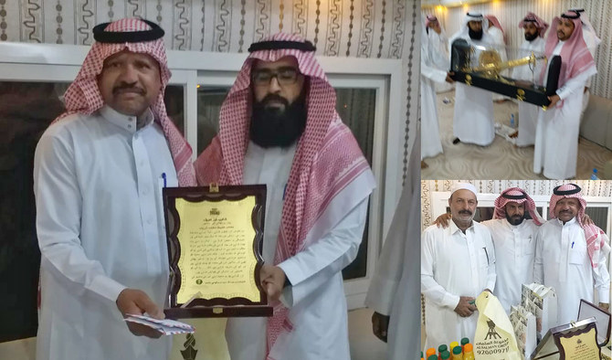 محمد حفیظ کو ان کے ساتھی خدمات کے اعتراف میں شیلڈ اور تحائف دے رہے ہیں فوٹو عرب نیوز