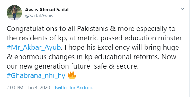 سماجی رابطے کی ویب سائیٹ ٹویٹرکے صارف عدیل راجہ نے حکومتی جماعت تحریک انصاف کو ٹیگ کرتے ہوئے لکھا ’خیبر پختونخوا میں پہلے ایف اے پاس عاطف خان کو صوبائی وزیر بنایا گیا اوراب میٹرک پاس صوبائی وزیر بنا دیا گیا۔ پاکستان تحریک انصاف تاریخ قائم کرتے ہوئے۔‘