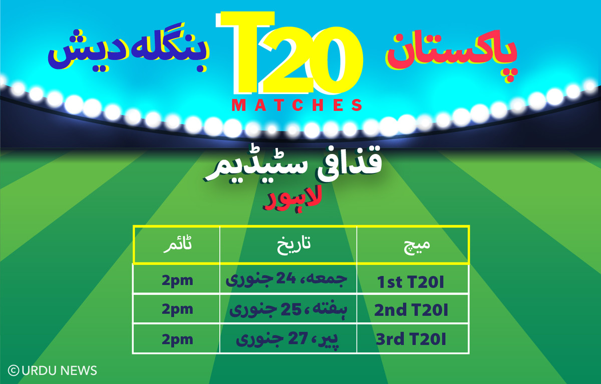 پاکستان کرکٹ ٹیم ہوم سیریز میں 24 جنوری کو مہمان ٹیم بنگلہ دیش کے خلاف پہلا ٹی20 میچ لاہور کے قذافی سٹیڈیم میں کھیلے گی۔