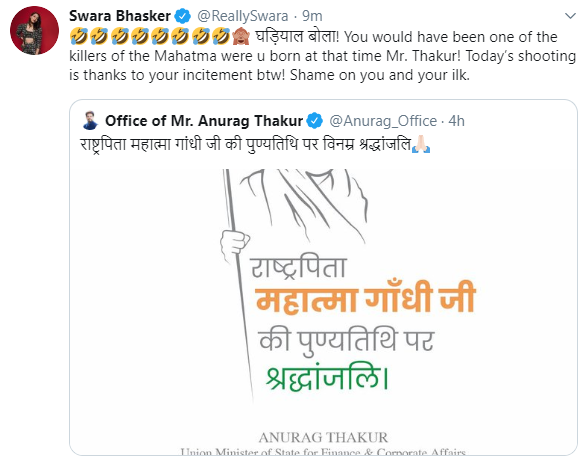 بی جے پی کے رہنما اور رکن پارلیمان انوراگ ٹھاکر نے بھی چند دن قبل دلی میں ہی متنازع شہریت بل کے خلاف مظاہرے کرنے والوں کو دھمکیاں دی تھیں۔ بالی وڈ اداکارہ اور متنازع شہریت قانون کے خلاف مظاہروں میں پیش پیش سوارا بھاسکر نے اپنی ٹویٹ میں انوراگ ٹھاکر کو سخت تنقید کا نشانہ بنایا۔ انہوں نے لکھا کہ ’آپ کے اشتعال انگیز بیانات کی وجہ سے جامعہ ملیہ کے طلبہ پر فائرنگ کی گئی۔ آپ کو شرم آنی چاہیے۔‘