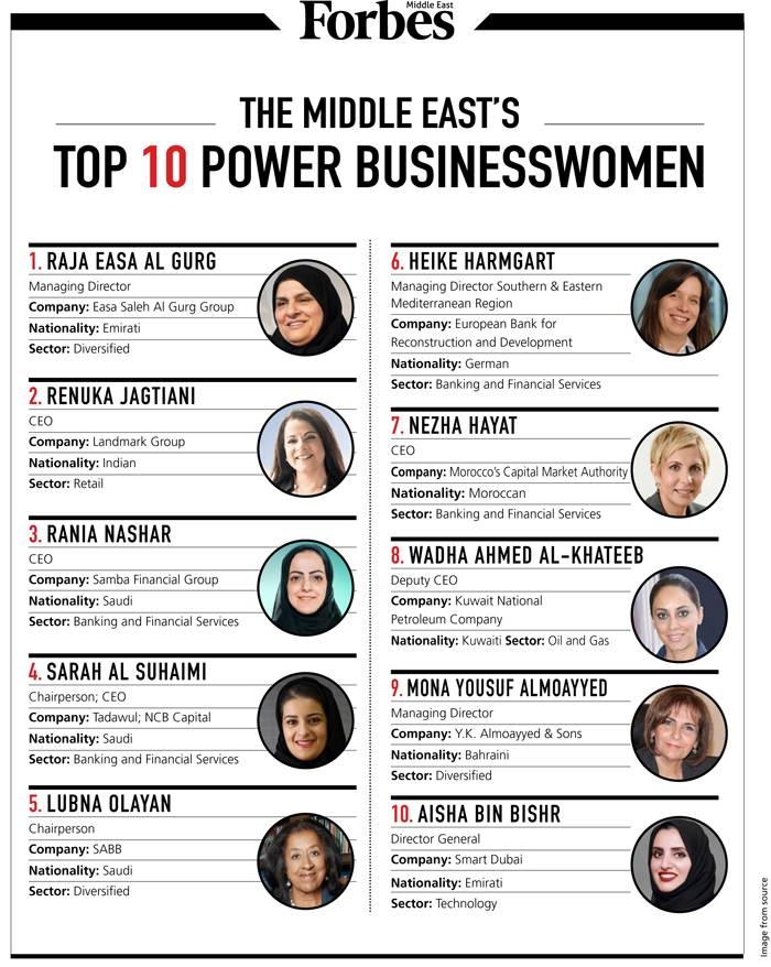 امریکی میگزین فاربز نے مشرق وسطیٰ کی 100 طاقتور ترین خواتین کی نئی فہرست جاری کی ہے۔ اس فہرست میں چھ سعودی خواتین بھی شامل ہیں جبکہ ٹاپ ٹین میں بھی تین سعودی خواتین نے جگہ بنائی ہے۔