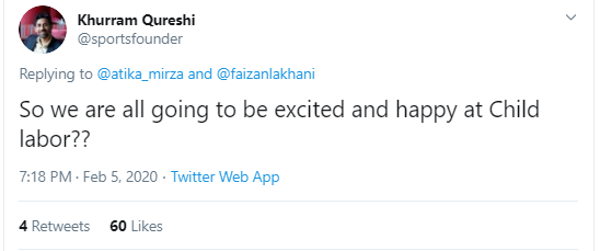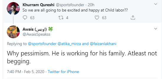 زاہد کے متعلق گفتگو دیکھ کر کچھ صارفین چائلڈ لیبر پر شکوہ کناں بھی دکھائی دیے۔ خرم قریشی نے لکھا کہ کیا اب ہم چائلڈ لیبر پر خوش ہوں گے؟
