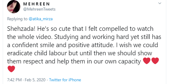 مہرین نے لکھا ’بچہ اتنا پیارا ہے کہ میں پوری ویڈیو دیکھنے پر مجبور ہو گئی۔ پڑھنے اور محنت سے کام کرنے کے باوجود بااعتماد مسکراہٹ اور مثبت رویہ ہے۔ کاش ہم چائلڈ لیبر سے پیچھا چھڑا سکتے تاہم جب تک ایسا نہیں ہو سکتا ہمیں ان کا احترام اور مدد کرنی چاہیے۔‘