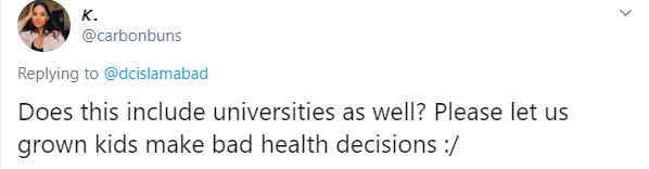 تعلیمی اداروں اور سافٹ ڈرنکس پر پابندی کا ذکر ہوا تو یونیورسٹی طلبہ اپنے لیے فکر مند دکھائی دیے۔ کاربن بنز نامی ہینڈل نے استفسار کیا کہ کیا اس کا اطلاع جامعات پر بھی ہوگا؟ ساتھ ہی مطالبہ کیا کہ ہم بڑے بچوں کو خراب صحت کے فیصلے خود کرنے دیں۔