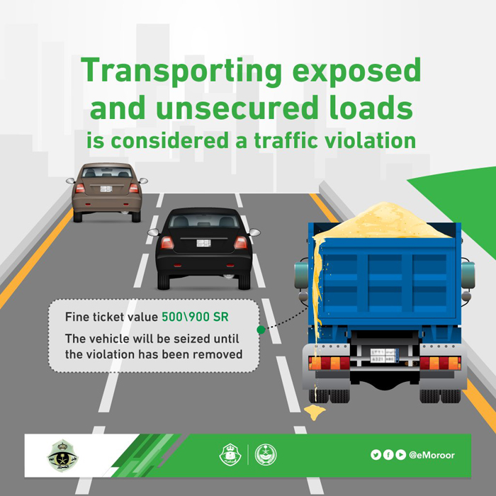 ٹریفک پولیس کی جانب سے ٹرک اور دیگر لوڈنگ گاڑیوں کے ڈرائیوروں کو خبردار کیا گیا ہے کہ ایسے ٹرک یا لوڈنگ گاڑیاں جن میں مٹی یا ریت لے جائی جا رہی ہوانہیں مناسب انداز میں ڈھکنا ضروری ہے۔ نہ ڈھکنے پر ٹریفک خلاف ورزی شمار ہوگی جس پر چالان 500 سے 900 ریال تک کیا جاسکتا ہے۔