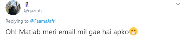 گفتگو کا حصہ بننے والے صارفین میں سے ایک، شاہ میر نے موضوع چھیڑنے والی فاطمہ سے گزارش کی کہ ان کی ای میل آئی ڈی پروفیشل ہے، انہیں تو ملازمت دے دیں۔ انہیں جواب میں ملازمت یا اس کی یقین دہانی تو نہیں ملی البتہ یہ سننا پڑا کہ ’بچپن سے پروفیشل آئی ڈی رکھنے کے باوجود انہیں تو کسی نے ہائر نہیں کیا۔‘