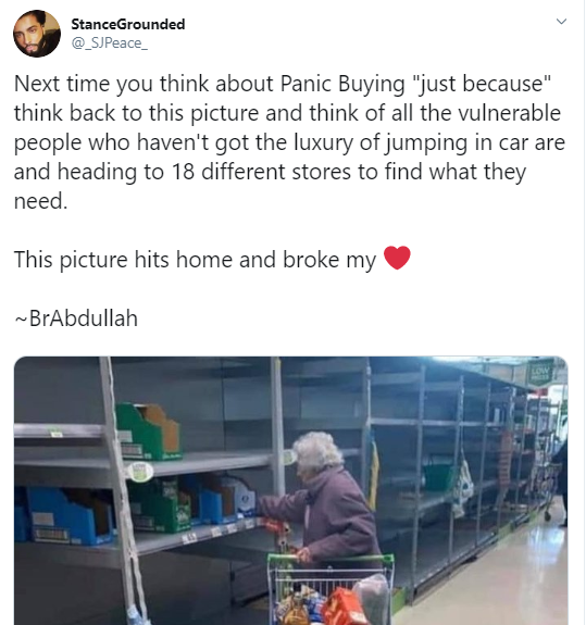 امریکہ میں مقیم ایک پاکستانی نے سٹانس گراؤنڈڈ نامی ہینڈل سے تصویر شیئر کرتے ہوئے لکھا ’دوبارہ جب آپ خوفزدہ ہو کر اضافی خریداری کریں تو اس تصویر کو ضرور یاد رکھیے گا کہ ایسے لوگ بھی ہیں جو خیال آتے ہی کار میں کود کر 18 مختلف سٹورز تک پہنچتے اور اپنی ضرورت بھری چیزیں نہیں لے سکتے۔‘