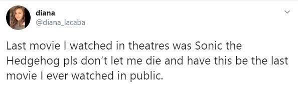 ڈیانا نامی صارف نے سینیما میں دیکھی گئی آخری فلم کا ذکر کرتے ہوئے لکھا ’پلیز مجھے مرنے نہ دیں تاکہ یہ پبلک میں دیکھی گئی میری آخری فلم نہ بنے۔‘
