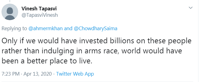 وینیش تپاسوی نامی صارف نے لکھا کہ 'اگر ہم اسلحے کی دوڑ میں شامل ہونے کے بجائے ان لوگوں پر لاکھوں روپے لگاتے تو یہ دنیا رہنے کے لیے ایک بہتر جگہ ہوتی۔'
