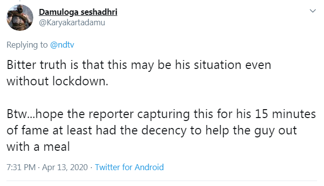 دامولوگا سیشادھری نامی ٹوئٹر ہینڈل نے لکھا کہ 'تلخ حقیقت تو یہ ہے کہ اس شخص کی یہ حالت لاک ڈاؤن کے نہ ہوتے ہوئے بھی ہوسکتی ہے۔'