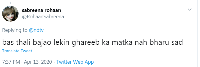 ایک اور صارف سبیرینہ روحان نے لکھا کہ 'بس تھالی بجاؤ غریب کا مٹکا نہ بھرنا۔'