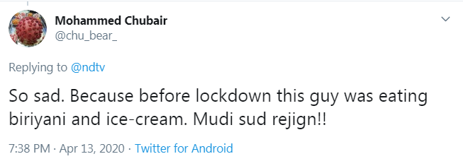 محمد چوبیر کے نام سے ٹوئٹر ہینڈل نے طنز کرتے ہوئے لکھا کہ 'بہت افسوس کیونکہ لاک ڈاؤن سے پہلے تو یہ شخص بریانی اور آئس کریم کھا رہا تھا نا۔'