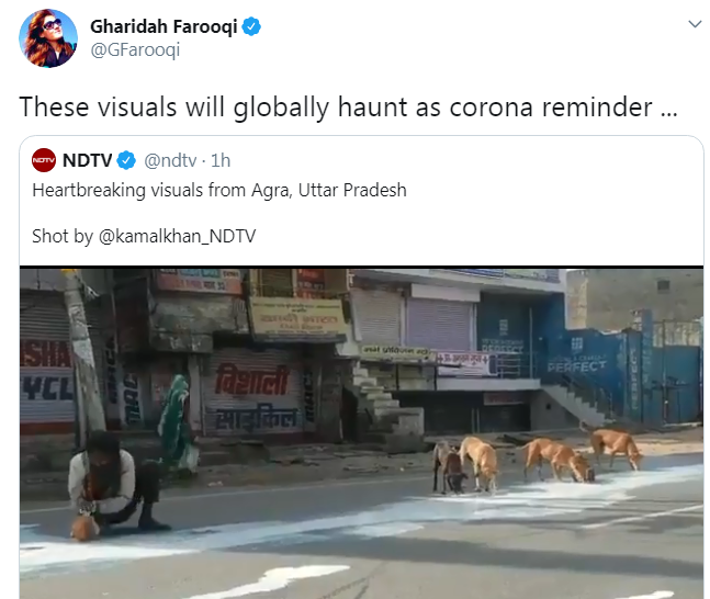 ساتھ ہی انہوں نے اس منظر کو اپنے کیمرے میں عکسبند کرنے والے صحافی کے حوالے سے لکھا کہ امید ہے کہ جس رپورٹر نے مشہور ہونے کے لیے یہ ویڈیو بنائی ہے اس نے اس شخص کو کھانا ضرور دیا ہوگا۔