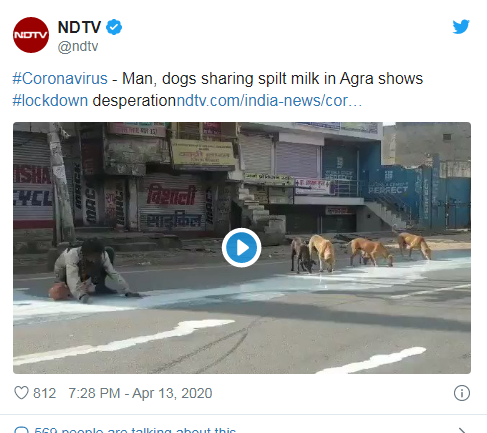 سڑک پر گرا دودھ، جسے پینے کے لیے جمع چند آوارہ کتے اور ان کتوں کے درمیان اسی دودھ سے اپنی بھوک اور پیاس مٹاتا انسان۔ انڈیا میں سوشل میڈیا پر ایک ویڈیو گردش کر رہی ہے جس نے لاک ڈاؤن سے غریب عوام کے لیے پیدا ہونے والی صورتحال کو بے نقاب کر دیا ہے۔