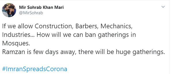 ٹوئٹر صارف میر سہراب کا کہنا تھا کہ اگر ہم تعمراتی کام شروع کروا دیں گے آگے رمضان آ رہا ہے ہم پھر مساجد میں آنے والے ہجوم کو بھی نہیں روک پائیں گے۔