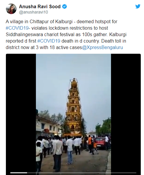 نیو انڈین ایکسپریس کی صحافی انوشا روی سود نے ویڈیو شیئر کرتے ہوئے لکھا کہ 'کالبرگی کے ایک گاؤں چتتاپور جو کہ کووڈ 19 کا بہت حد تک ہاٹ سپاٹ ہے وہاں لاک ڈاؤں کی خلاف ورزی کی گئی ہے جہاں سدھالنگیشور رتھ تہوار کے لیے سینکڑوں افراد یکجا ہوئے۔ اس ضلعے میں ملک میں کووڈ 19 سے پہلی موت ہوئی تھی اور اب تک کل تین اموات ہو چکی ہیں جبکہ 18 ایکٹو کیسز ہیں۔'