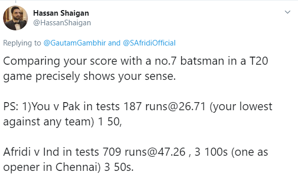 ٹوئٹر صارف حسن شیغان نے لکھا کہ ’آپ کے پاکستان کے خلاف ٹیسٹ میچز میں 187 رنز 26.71 کی اوسط سے ہیں اور یہ کسی بھی ٹیم کے خلاف سب سے کم رنز ہیں جب کہ دوسری طرف شاہد آفریدی کے انڈیا کے خلاف ٹیسٹ میچز میں 709 رنز 47.26 کی اوسط سے ہیں۔ جس میں بطور اوپنر تین سنچریاں بھی شامل ہیں۔‘