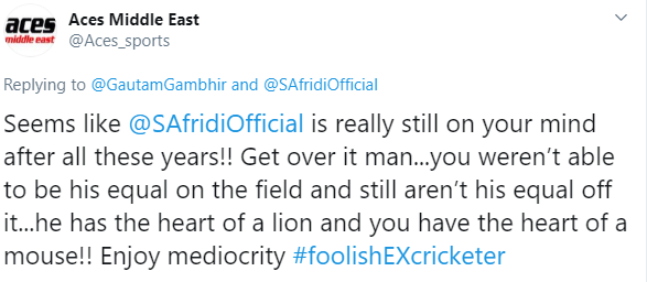 ٹوئٹر پر گھمبیر نے بوم بوم آفریدی کو مخاطب کرتے ہوئے لکھا کہ ’شاہد آفریدی! میں آپ کو یاد دلاتا ہوں 2007 ٹی ٹوئنٹی ورلڈ کپ میچ میں54 گیندوں پر 75 رنز بنائے تھے اور اس میچ میں آفریدی بغیر کوئی رن بنائے آؤٹ ہوئے تھے اور ہم ورلڈ کپ جیت گئے تھے۔‘