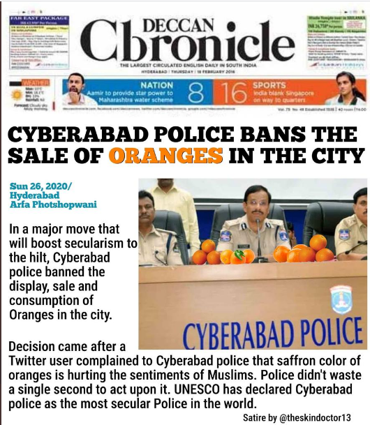 اس فوٹوشاپڈ امیج میں لکھا گیا تھا کہ 'سائبرآباد پولیس مالٹے بیچنے پر اس لیے پابندی عائد کر رہی ہے کیونکہ مالٹے زعفرانی رنگ کے ہوتے ہیں۔ یونیسکو نے سائبرآباد پولیس کو دنیا کی سب سے سیکولر پولیس قرار دیا ہے۔'