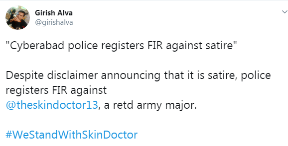 دا سکن ڈاکٹر نامی ٹوئٹر ہینڈل نے اپنے اکاؤنٹ پر وضاحت کرتے ہوئے لکھا کہ ' سائبرآباد پولیس نے جس طنز کو 'جھوٹی خبر' سمجھا ہے۔ یہ کتنا مضحکہ خیز ہے۔'