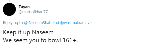ایک اور صارف زیان نے لکھا کہ 'نسیم ایسے ہی کارکردگی دکھاتے رہیے، ہم آپ کو 161 سے زیادہ کی سپیڈ میں بولنگ کرتے دیکھنا چاہتے ہیں۔'