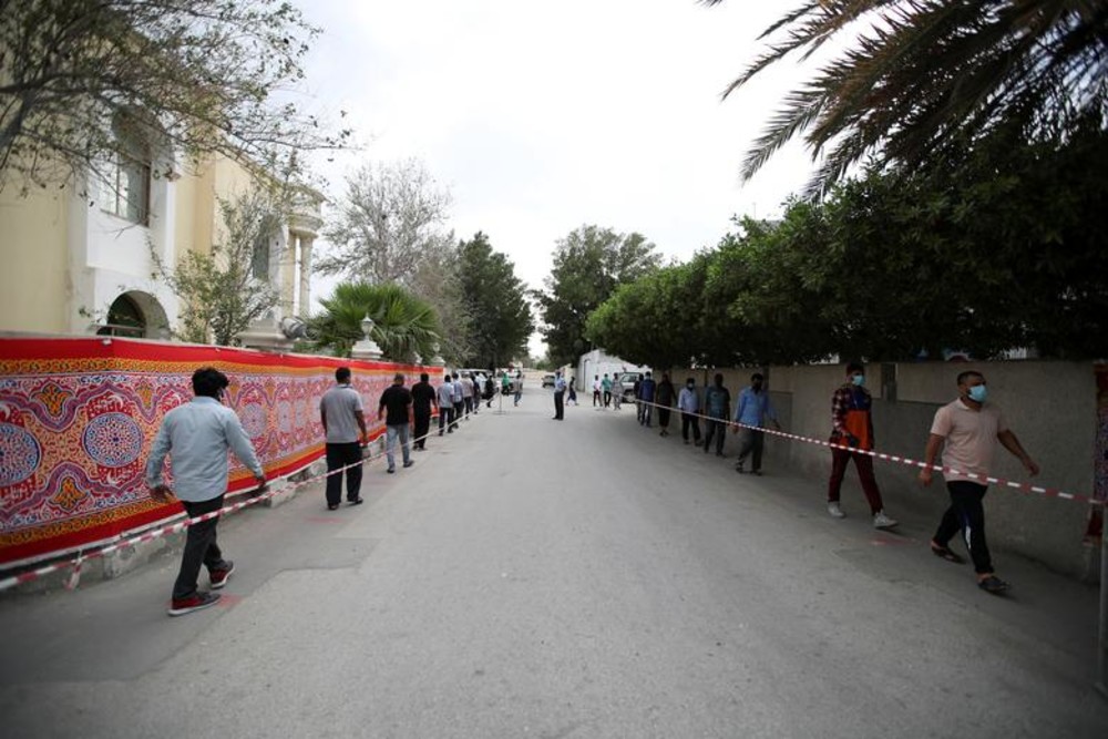 بحرین کے دارالحکومت میں مسلمان سماجی فاصلے کا خیال رکھتے ہوئے کھانا وصول کرنے لیے قطاروں میں کھڑے ہیں