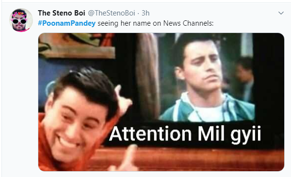 ایک اور صارف سٹینو بوائے نے میم شیئر کرتے ہوئے لکھا کہ 'پونم پانڈے کا نام خبروں میں دیکھ کر یہی لگا کہ توجہ مل گئی۔'