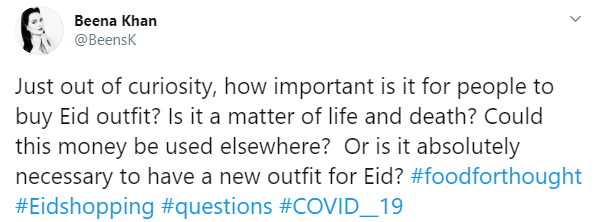 بینا خان بھی عید شاپنگ کے لیے خود کو خطرے میں ڈالنے کے خیال سے متفق نہ ہوئیں۔ اپنی ٹویٹ میں انہوں نے پوچھا ’عید کے لیے خریداری کتنی ضروری ہے؟ کیا یہ رقم کہیں اور استعمال ہو سکتی ہے یا نیا لباس بہت ضروری ہے؟‘ انہیں توجہ دلائی گئی کہ یہ سوال خریداری کے لیے دکانوں کے باہر موجود خواتین سے پوچھیں جس پر بینا خان کا کہنا تھا ’وہ بہت مصروف ہیں، ہمیں اس پر گفتگو کرنی چاہئیے۔‘