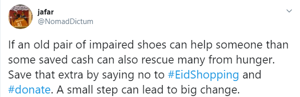 عید شاپنگ اور اس کے متبادل کا معاملہ پاکستان ہی نہیں بلکہ انڈیا میں بھی گفتگو کا حصہ رہا۔ جعفر نامی ایک صارف نے اپنی تجویز میں عید کی خریداری کے لیے استعمال ہونے والی رقم عطیہ کر کے دوسروں کو بھوک سے بچانے کا خیال پیش کیا۔ ساتھ ہی توقع ظاہر کی کہ ایک چھوٹا سا قدم بڑی تبدیلی کا پیش خیمہ ہو سکتا ہے۔