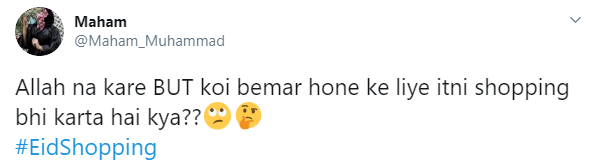 ماہم محمد بازاروں میں رش پر تشویش کا شکار ہوئیں تو پوچھا کہ ’اللہ نہ کرے لیکن کوئی بیمارے ہونے کے لیے اتنی شاپنگ بھی کرتا ہے کیا؟’