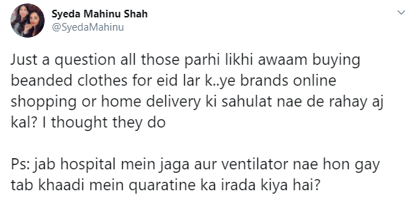 سیدہ ماہینو شاہ نے بازار جائے بغیر مقصد حاصل کرنے کے لیے موجود متبادل کی نشاندہی کی تو سوال اٹھایا ’برانڈڈ کپڑے خریدنے والی پڑھی لکھی عوام یہ برانڈز آن لائن شاپنگ کی سہولت اور ہوم ڈیلیوری نہیں دے رہے آج کل؟‘ پھر خود ہی جواب دیا ’وہ ایسا کر رہے ہیں‘۔