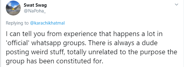 اپنے تجربے کا ذکر کرتے ہوئے سوات سواگ نامی ہینڈل نے لکھا ’ہمیشہ ایک فرد ایسا ہوتا ہے جو گروپ میں عجیب و غریب اور غیر متعلقہ مواد پوسٹ کرتا رہتا ہے۔‘
