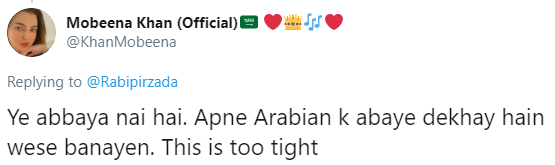 ٹوئٹر صارف مبینہ خان نے لکھا کہ 'یہ عبایا نہیں ہے، یہ دیکھنے میں بہت تنگ لگ رہے ہیں آپ کو چاہیے کہ عربی طرز کے برقعے بنائیں۔'