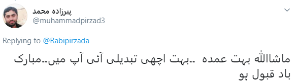 ایک ٹوئٹر صارف پیرزادہ محمد کا کہنا تھا کہ ’اچھی تبدیلی ہے آپ کو یہ تبدیلی مبارک ہو۔‘