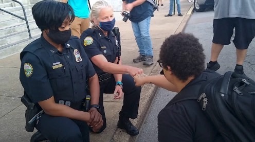 ریاست لوا کے شہر ڈیس موئنس میں پولیس چیف ڈانا ونگرٹ نے دیگر افسران کے ہمراہ مظاہرین کے سامنے گھٹنے ٹیک کر تصاویر بنائیں اور کہا کہ ’ہم علامتی طور پر ان کے ساتھ ہیں اور ہم یہی کر سکتے ہیں۔‘
