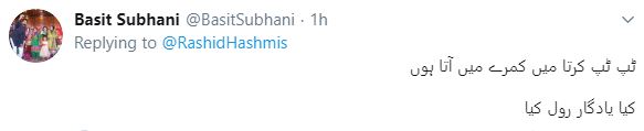جس کے جواب میں باسط سبحانی نے ان کی اداکاری کے حوالے سے لکھا کہ ’ٹپ ٹپ کرتا میں کمرے میں آیا ہوں، کیا کمال رول کیا۔‘