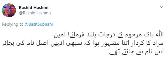 ٹوئٹر صارف راشد ہاشمی نے لکھا کہ ’اللہ پاک مرحوم کے درجات بلند فرمائے! آمین۔ مراد کا کردار اتنا مشہور ہوا کہ سبھی انہیں اصل نام کے بجائے اس نام سے جانتے تھے۔'