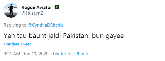 روگ ایوئیٹر کے نام سے ٹوئٹر ہینڈل نے لکھا کہ 'یہ تو بہت جلد پاکستانی بن گئی۔'