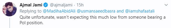 نجی ٹی وی چینل کے اینکر پرسن اجمل جامی نے کہا کہ کسی سیاسی عہدیدار سے ایسے رویے کی امید نہیں تھی۔