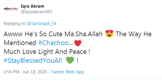 اقرا اکرم نامی صارف نے لکھا کہ 'یہ بہت معصوم ہے ماشااللہ۔ جیسے اس نے چاچو کہا۔ بہت سارا پیار۔'