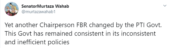 ٹیلی ویژن میزبان عنبر رحیم شمسی نے نئے چیئرمین کی تعیناتی کی اطلاع دی تو ساتھ ہی لکھا کہ یہ دو برسوں میں تعینات کیے جانے والے ایف بی آر کے پانچویں چیئرمین ہیں۔